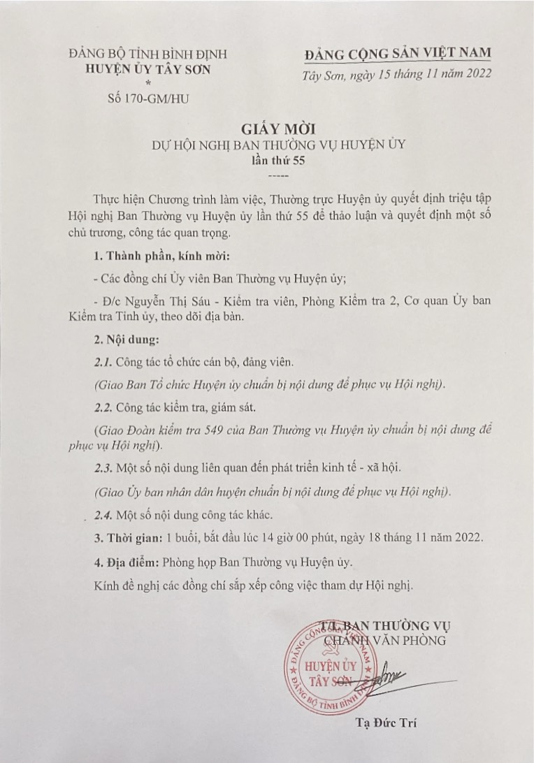 Giấy mời Hội nghị Ban Thường vụ lần thứ 55
